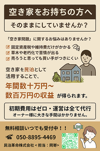 現在、日本全国には900万戸を超える空き家があると言われており、特に地方物件や相続された物件では、「固定資産税や維持費だけがかかっている」「使わずに放置している」といったケースが非常に多くなっております。空き家を民泊として活用いただくことで、毎月の不動産コストを収入に変えることが可能になります。地方の一戸建てでも月収30万~100万円を生み出す事例も珍しくありません。