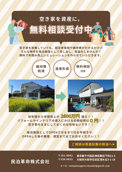 弊社は全国で民泊施設の設立・運営代行を行っているほか、民泊施設の日本一を決めるコンテスト「BEST OF MINPAKU」を主催しており、物件に合わせた最適なご提案が可能です。弊社ではオーナー様の初期費用0円で始められるプランもご用意しております。 リフォーム・家具家電・インテリアまで、ずべて弊社負担で導入し、宿泊収益から回収する仕組みのため、オーナー様の初期投資は不要です。